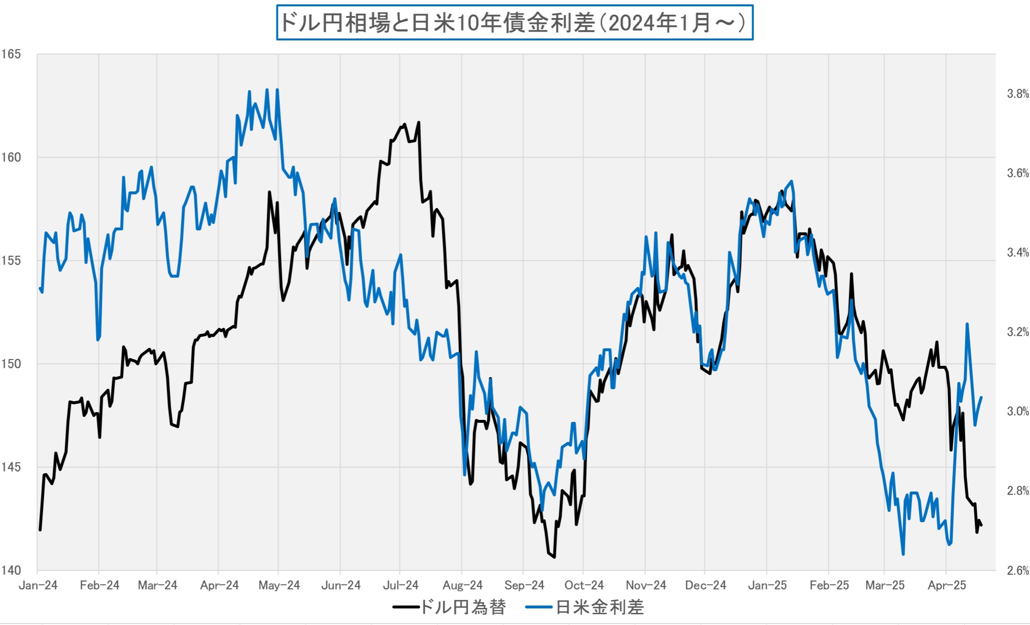 続いて、日米金利差との比較。こちらは既に2025年2月以降、まとも相関関係が存在しているとは言えない。ついこの間まで、FRBの金融政策、或いは、日銀の金融政策の変更を最大の論点として語られていたドル円相場が、そのどちらでも全く説明がつかない展開になっているのは事実だ。「いや、だからこそ米ドルが売られている証拠だ」という人がいるのかも知れない。ただ、100歩譲ったとしても、そのドル売りの裏側に「実需」が見えないのも事実だ。ここで言う「実需」とは、単に貿易為替のことを言っているのではなく、資本の動きに伴うもの。平たく言えば、「米国債売り」に伴うものだが、そもそも「米国債」が売られているということが金利水準から確認出来ない(ガクンと金利低下して、その分、金利上昇したのは事実)以上、為替市場だけでの恣意的な相場操縦、つまり短期筋のマニピュレーションと捉えるのが、最も妥当だと思われるが如何だろう。