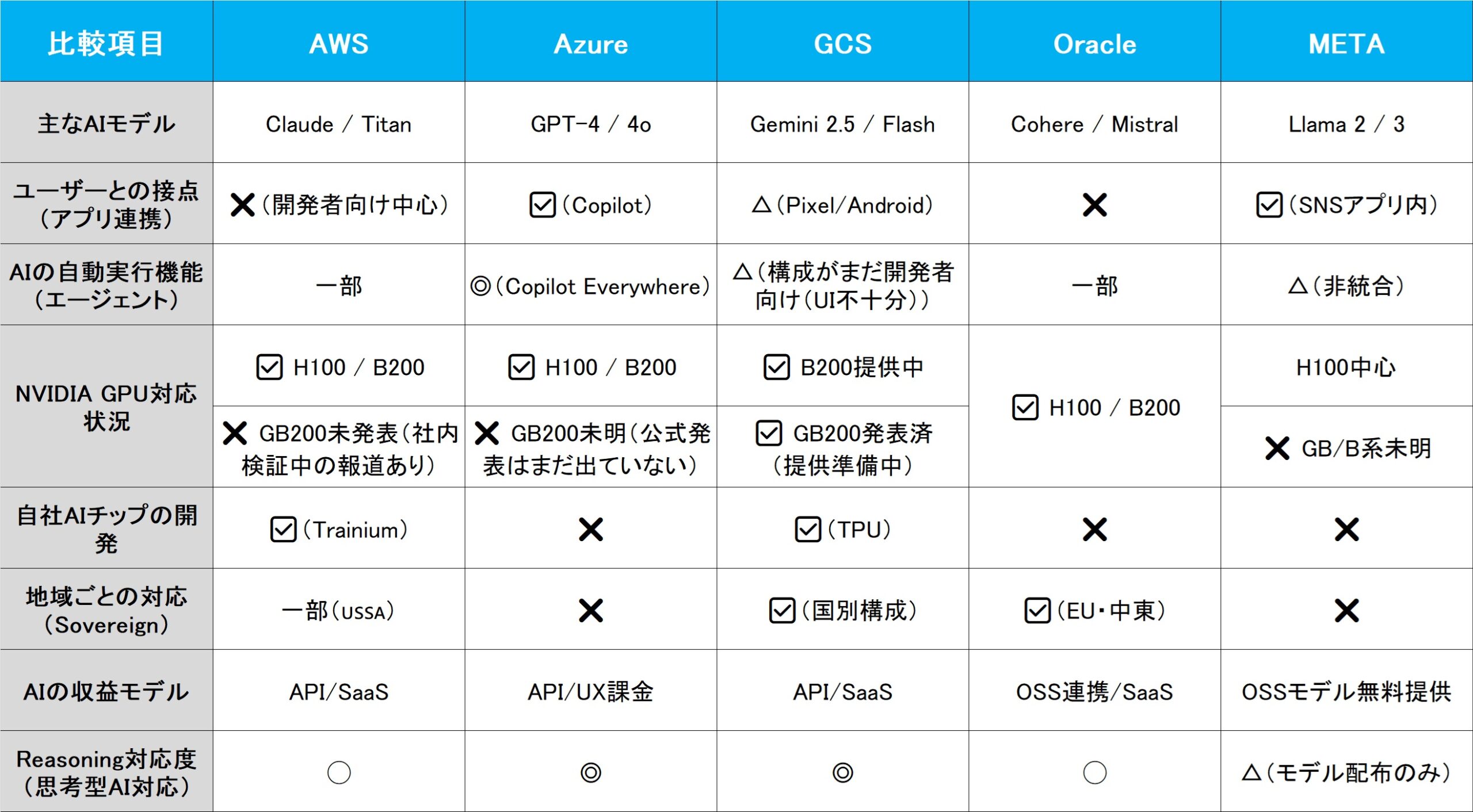 - 最新アーキテクチャ(Blackwell)も、各クラウド事業者がほぼ標準採用