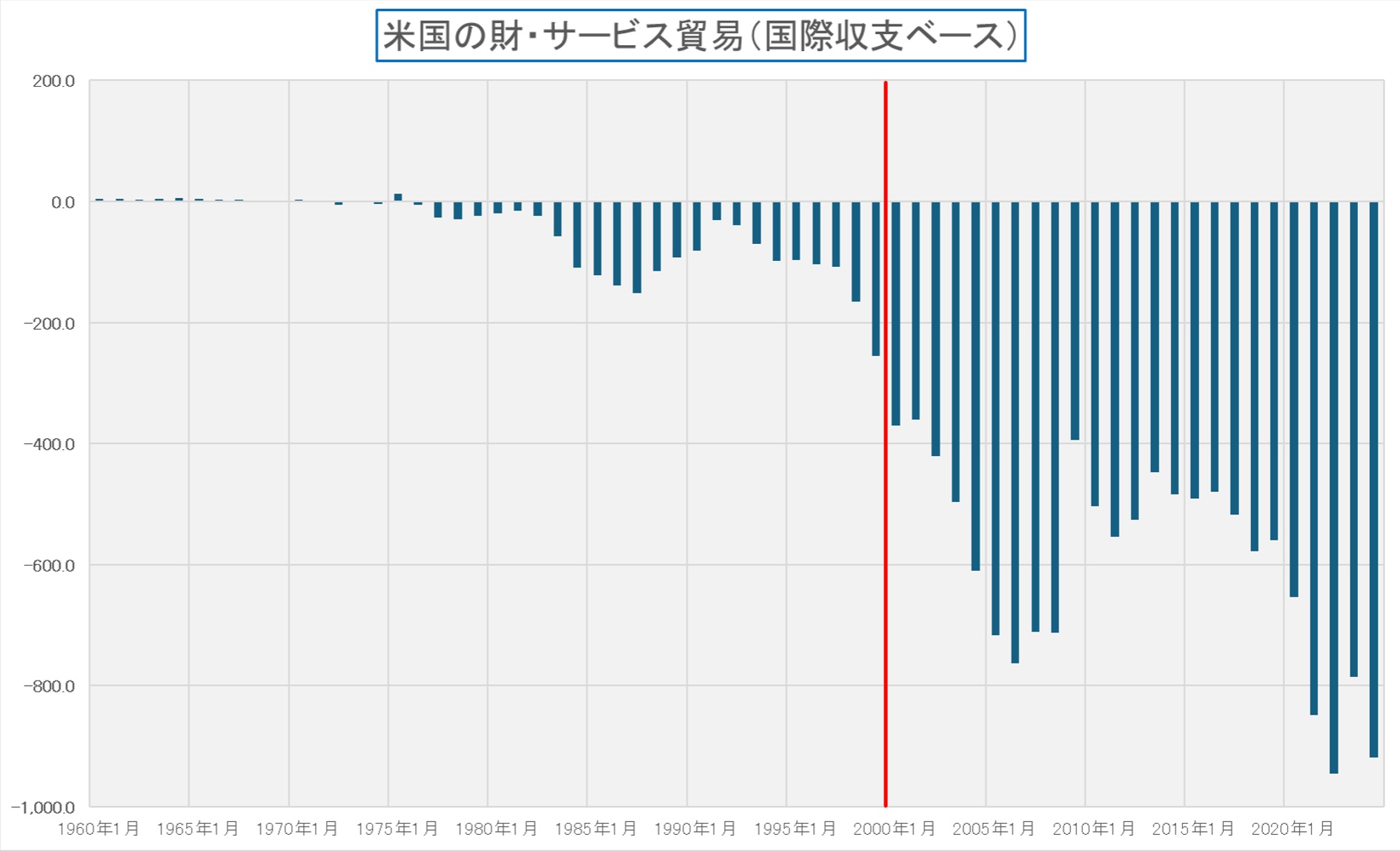 土曜日(26日)の日経朝刊の一面には「自由貿易「盟主」降りる米国 G20で関税に批判集中 次の均衡探る世界」という文字が並んでいた。ただ、下のチャートで示す巨額の赤字推移、そうアメリカの貿易赤字の推移を見ても、「それは自由貿易の「盟主」なのだから、仕方ないだろう。」と片付けてしまえることなのだろうか。そして更に、多くの識者と呼ばれる人たちは、きっとこう続けるだろう。「アメリカの貿易赤字の主たるターゲットは『中国だ』。アメリカがWTOに中国を引き込んだ、その判断が間違っていたのだから、何を今さら言い出すんだ。自業自得だ。」と。事実、この新聞記事には巨額に膨らむ貿易赤字のことを盾に、あたかも米国が強権発動してきたと非難口調、少なくとも一般の読者には米国側が理不尽極まりない変節だと言わんがばかリであるが、本当にそうだろうか?