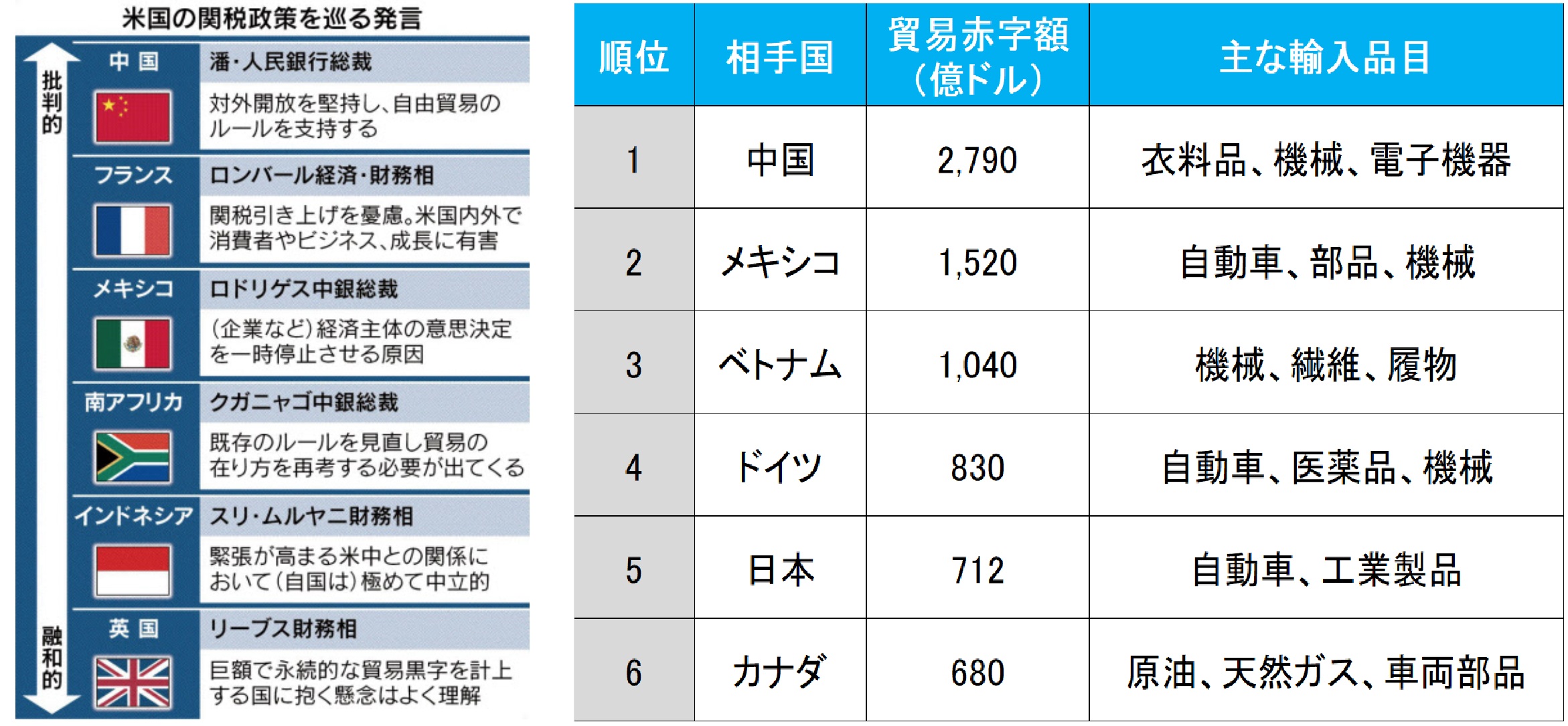 例えば、この米国の貿易赤字の推移を頭に入れて置いて貰った上で、下の図も見て頂こう。これは、その日経新聞の記事の中にあったG20での関税を巡る発言で批判的であったものの例の横に、貿易赤字の金額別序列の表を重ねたものだ。融和的とある英国は、対米国では英国が貿易赤字で、米国側から見ると貿易黒字の国だ。そりゃあ、誰がどう見たって、貿易赤字を与えているトップ1,2の中国とメキシコが、アメリカの悲鳴を好意的に聞き入れるわけがなく、寧ろ、「このままであるべきだ」と言うのが当たり前だろう。因みに、フランスは第16位、インドネシアは第15位、南アフリカは第20位と決して低位ではない。また、日本は2019年以前は久しく中国に次ぐ、米国の貿易赤字国第2位に位置していたことも事実だ。