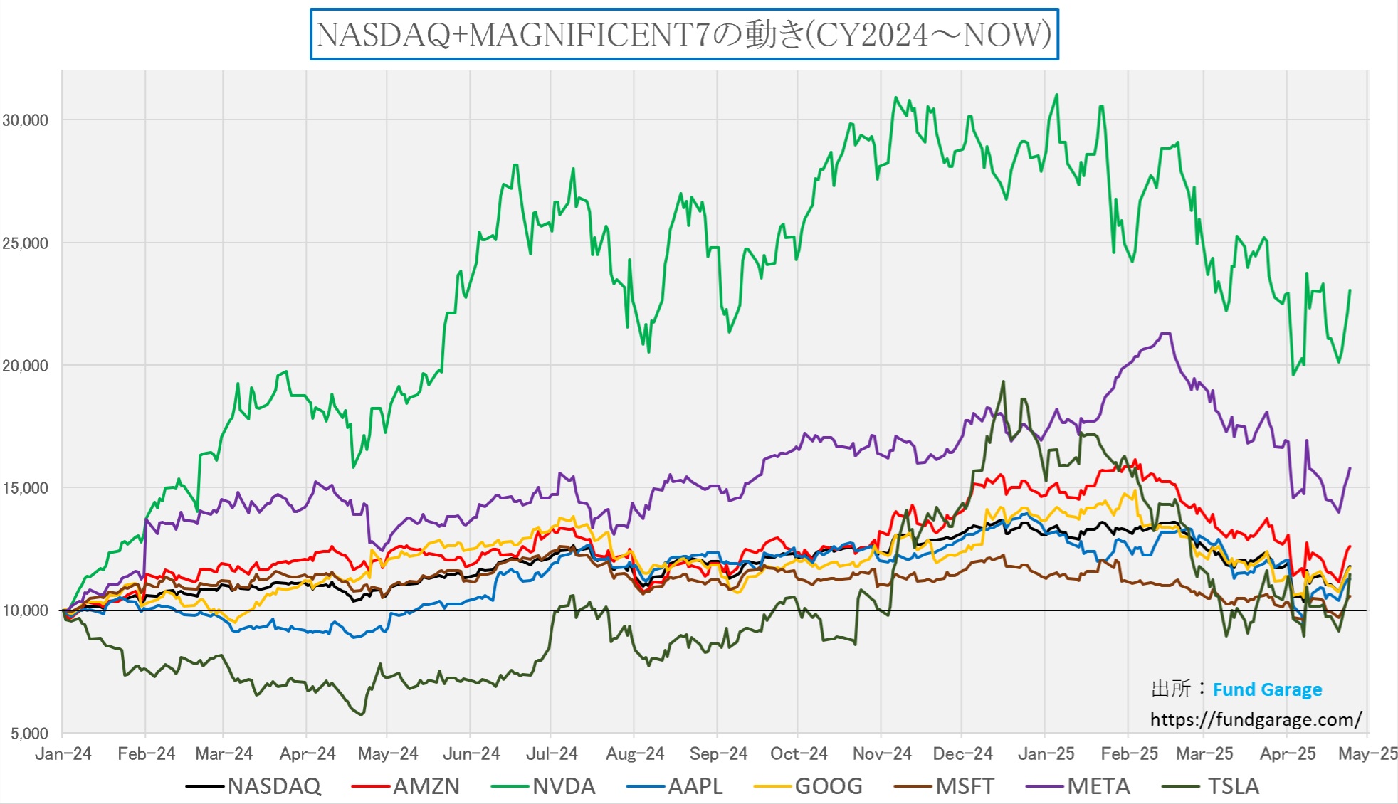 もう一枚、個別銘柄ではあるが、いわゆる「マグニフィセント7」の昨年初めからの動きを指数化してみたのが下のチャートだ。まず言えることは、2024年初めからの僅か1年4カ月足らずではなるが、テスラ(TSLA)も含めて、マグニフィセント7の全銘柄がプラスになっているということをお伝えしておこう。一番厳しい状況にあるのがマイクロソフト(MSFT)だが、それでも+5.66%だ。トップは言わずもがなのエヌビディア(NVDA)だが、+230.46%と僅か1年と1四半期程度でやはり2倍以上になっている。