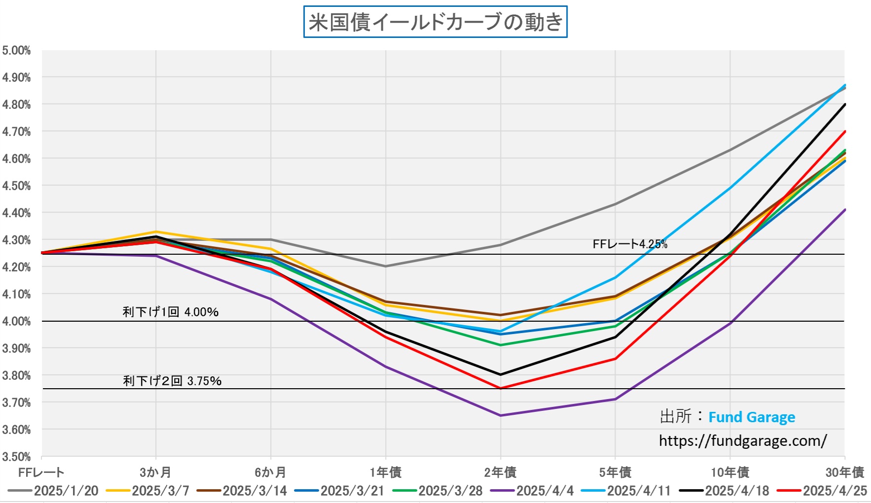 下のチャートが、それを証明するイールドカーブの動き。「金利急騰!米国売り!」と見るからに悲観を煽っているだけだろうと読める文字列をたくさん見ている(現在完了進行形)が、ご覧の通り、1月20日のトランプ大統領就任時の金利水準をイールドカーブ自体が超えることは、未だ起きていない。この週末の終値のイールドカーブは赤い線、1月20日が最上段のグレーのラインだ。