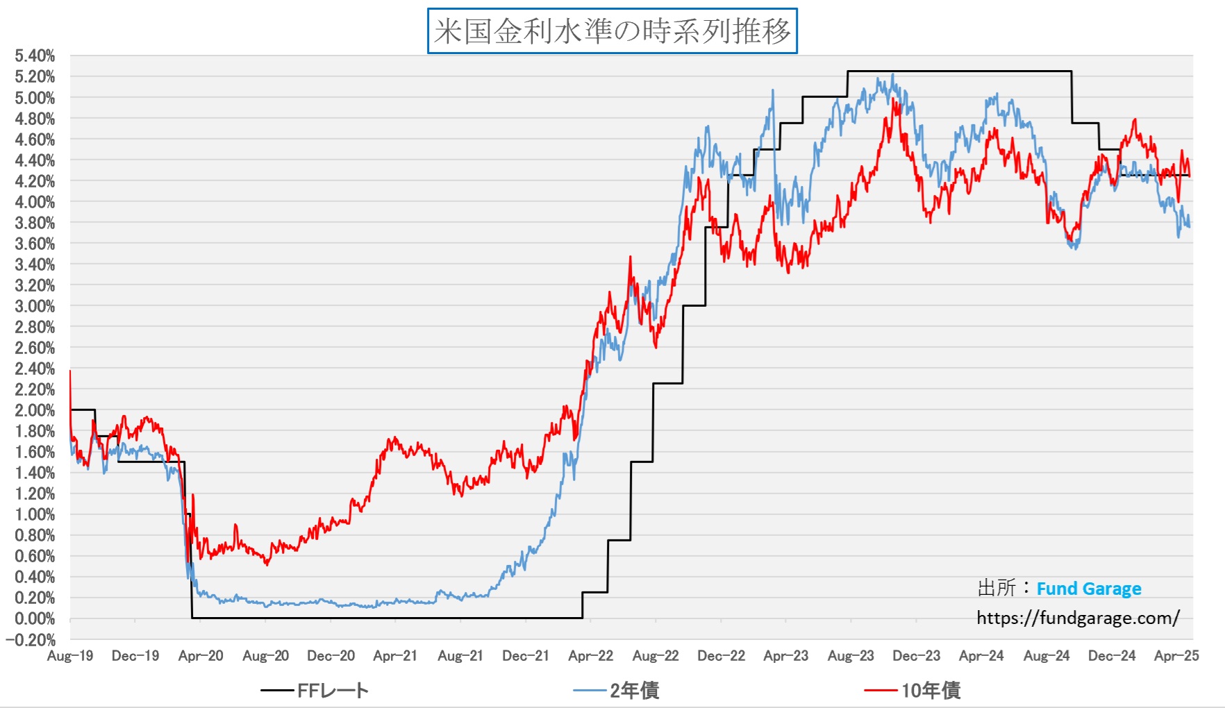 念のため、もう一枚、ご紹介しておこう。下のチャートは米国債2年物と10年物、それにFFレートの推移を示したものだが、金利が急騰したという動きは、言葉のインパクトが伝えるほどの事態とはなっていない。寧ろ、2022年あたりからの、通常の範囲内でのアップ&ダウン程度にしか見えないのは私の気のせいだろうか?