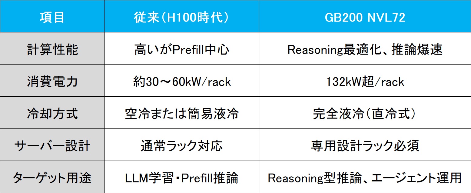 - 消費電力・冷却設計の一新(NVL72、液冷前提)