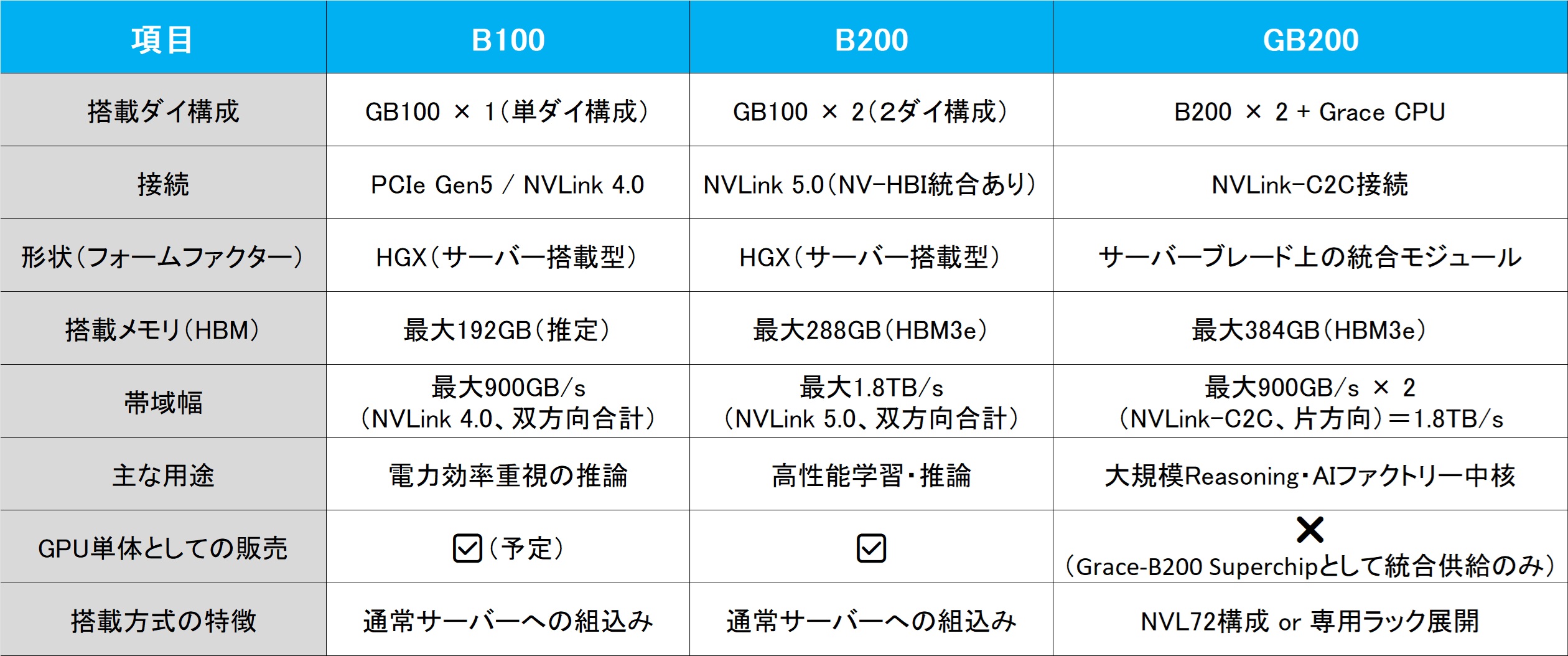 - 冷却方式(液冷)、電源設計、通信網(NVLink Switch System)まで一体化