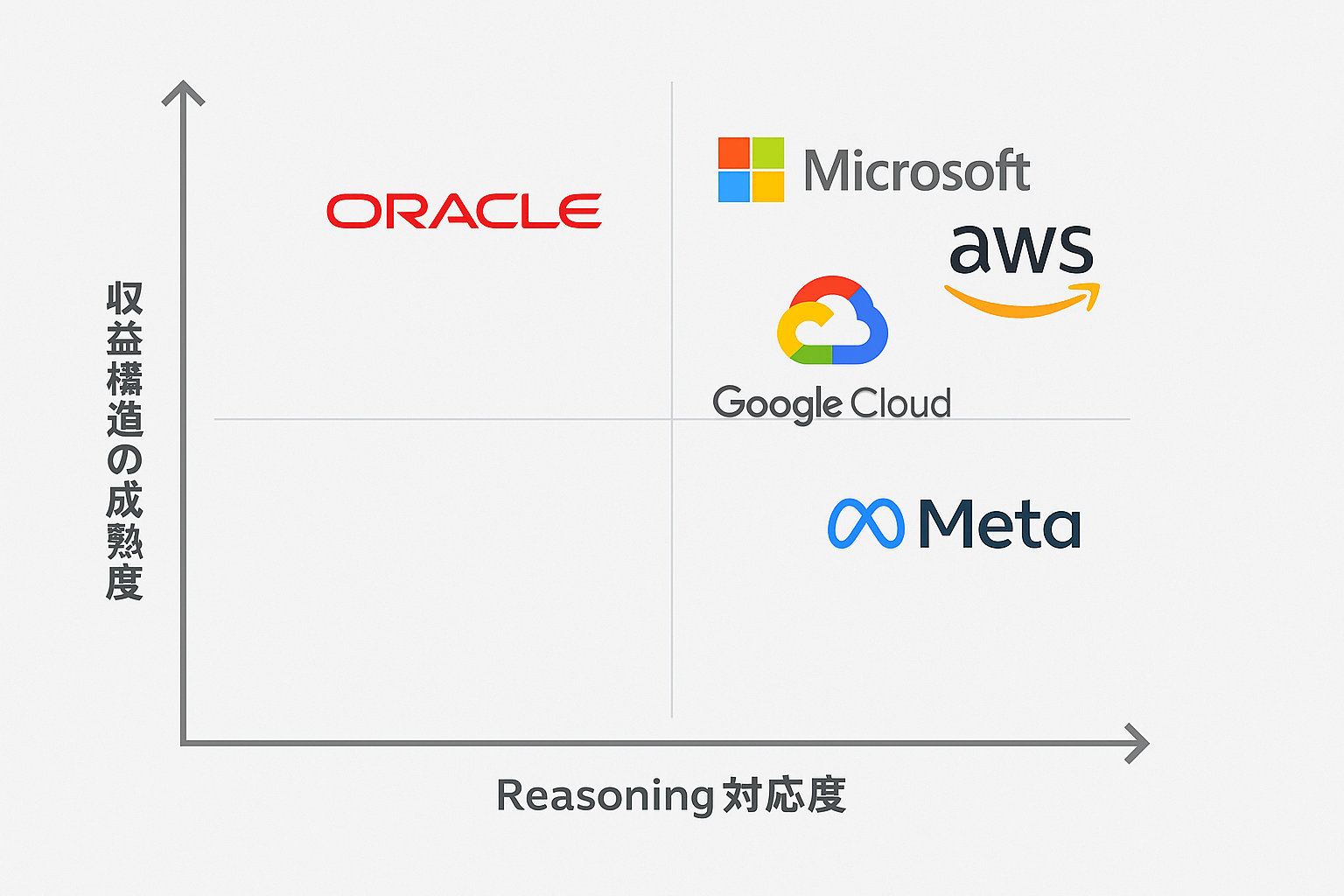 各社のAI戦略の成熟度を、「Reasoning型AIへの対応」と「収益モデルの確立」という2軸で俯瞰した。MicrosoftやAWSは両軸で高水準に位置する一方、METAはReasoning適性を模索中であり、Oracleは収益性は高いがReasoning対応が課題となっている。