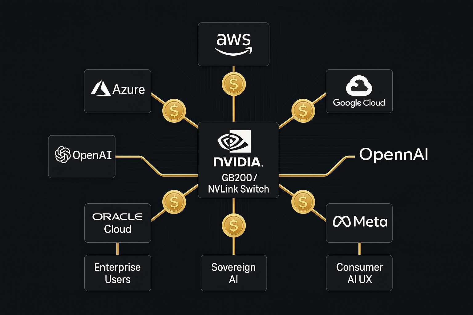 GB200およびNVLink Switchによって、NVIDIAはクラウド事業者(AWS, Azure, GCS)、OSSコミュニティ(OpenAI, Meta)、ソブリンAIやエンタープライズ領域までをもつなぐ中核インフラとなりつつある。これが“中央銀行”に例えられる構造支配の要諦である。