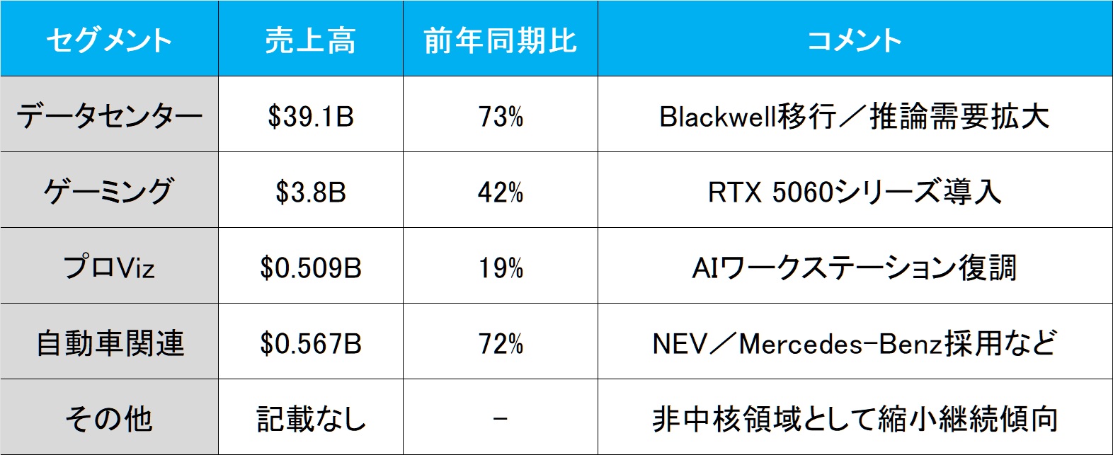 NVIDIAの成長の原動力は、もはや単なるグラフィックス・プロセッサの供給に留まらない。今回の決算では、それが数字としても極めて明確に表れた。以下が、セグメント別の売上構成と前年同期比の成長率である。