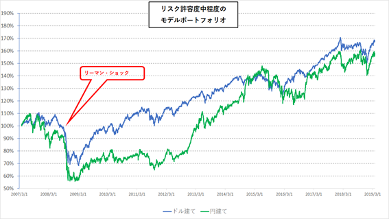Fund Garageが国際分散投資用に提案する「リスク中程度のモデルポートフォリオ」の3月末のパフォーマンスは、ドル建てのポートフォリオが2月末165.76%から168.28%まで約1.52%の上昇となりました。円換算後でも155.84%から158.25%まで約1.55%の上昇です。僅かですが円安(3銭)になった分だけ微妙に円換算分が上昇しています。
