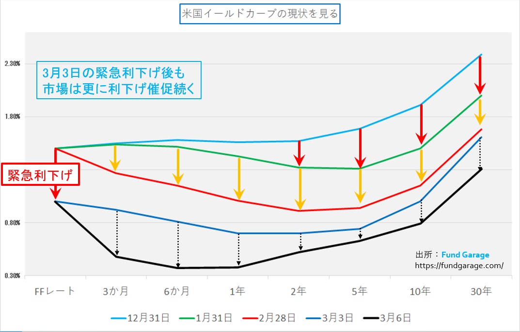原稿執筆時点では既にFRBが緊急利下げを行ったことが分かっているので、後出しジャンケンに思われてしまうかも知れないが、実は米国債のイールド・カーブの変化の仕方で、FRBが利下げに踏み切らざるを得ないところまで追い込まれてたは明らかだった。この際なので先週末3月6日までのイールド・カーブの形状変化を12月末から追ったものを下記に示す。
