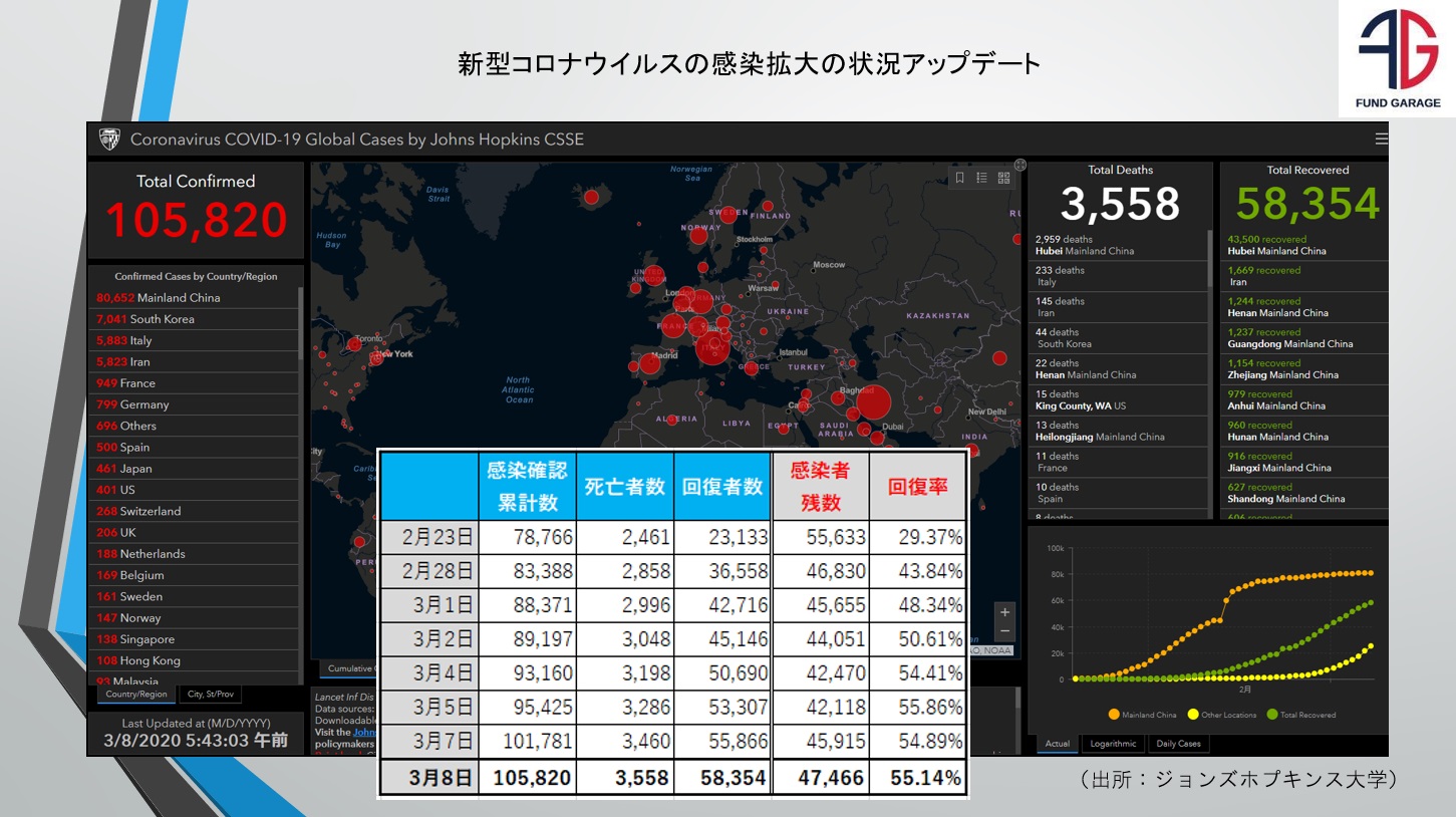 カリフォルニア州サンフランシスコ沖合に停泊している「ダイヤモンド・プリンセス」の姉妹船「グランド・プリンセス」を発端としたサンフランシスコ(シリコンバレーのお膝元)の状態、或いはNY州の緊急非常事態宣言なども加わって、またイタリアや韓国での感染者数の爆発なども騒がれるので、状況は冷静さを欠いているように思われる。報道される人数が増えれば怯えるのも無理はないが、やはり分母を考えて、確率で捉えるようにしないと要らぬパニックに巻き込まれる。この辺は「簡単、冷静に市場動向を読み解く方法。天邪鬼の奨め」なども参考にして欲しい。