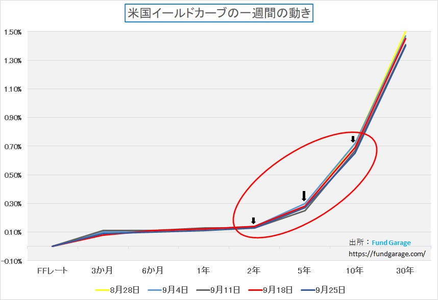 因みに、下記に先月一週間毎の米国債イールドカーブの変化を記録したチャートお見せします。ご覧頂ける通り、実は8月下旬から米国債券市場は殆ど動いていません。実に落ち着いたものです。