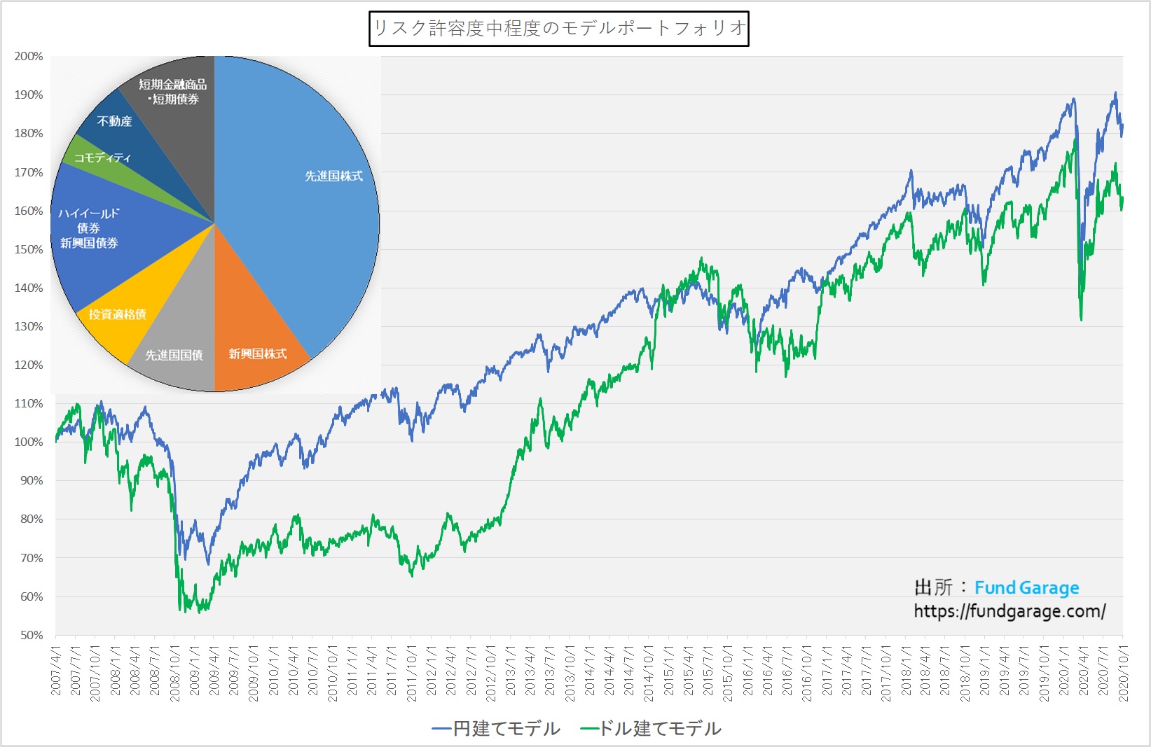 「リスク中程度のモデル・ポートフォリオ」の9月末までのパフォーマンスは、ドル建てポートフォリオで設定来が月末182.40%となり、年初来のパフォーマンスは絶対値でマイナス△1.22%となりました。円建てポートフォリオは9月末時点で163.59%ですから、年初来のパフォーマンスはやはりマイナスの△3.84%となります。8月31日のドル円相場が105.37円から9月30日付の評価の105.79円とやや円安方向へ動いたため、若干ながらプラスに寄与しております。さはさりながら、昨年末108.67円からの円高が現状でも大きく足を引っ張ったままです。
