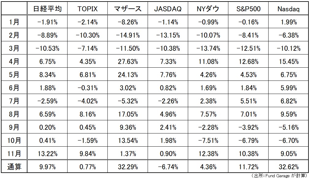 やはり市場は11月に入ってから再び「リスクオン」に変わっています。結果として先進国株式は好調な戻りを演じていますが、日本市場と米国市場の代表的なインデックスの年初来から11月17日迄の各月次の指数騰落率を下記にご紹介します。あまり思い出したくもないことが沢山あった2020年ですが、私たち投資家が対峙してきた市場の動きを振り返ってみるのは意味のあることです。
