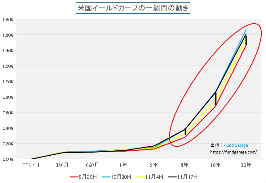 一つ目の要点は殆どが機関投資家だけで構成される債券市場に動揺が走っているかをチェックするということで、イールドカーブの変化を見ることの重要性についてご紹介しました。下のチャートは、9月末(赤)、10月末(青)、大統領選挙投票日の11月4日(黄色)、そして昨日11月17日(黒)のイールドカーブを4本表示してあります。