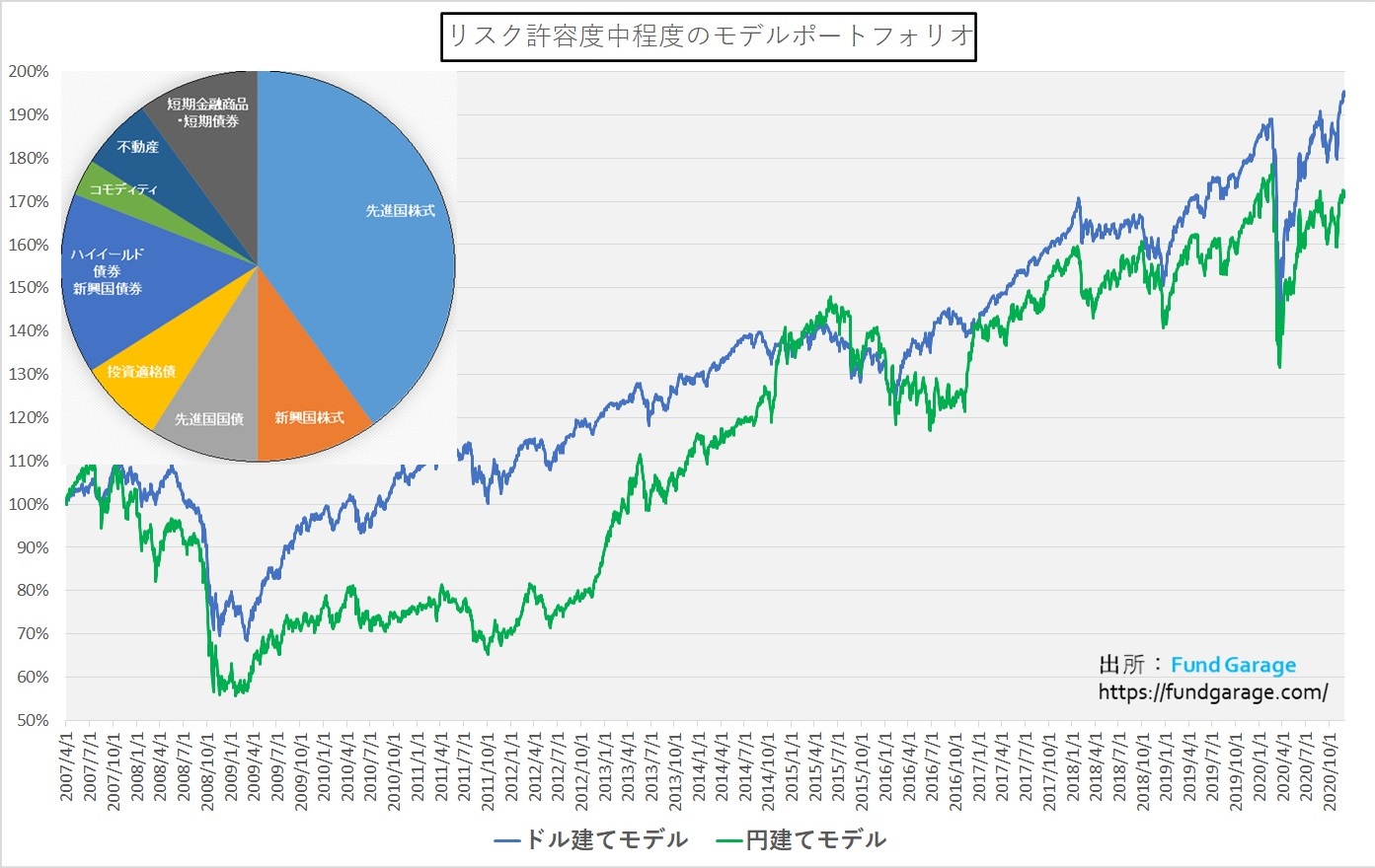 「リスク中程度のモデル・ポートフォリオ」の11月末までのパフォーマンスは、ドル建てポートフォリオで設定来が月末199.43%となり、年初来のパフォーマンスは絶対値でプラス5.24%となりました。円建てポートフォリオは11月末時点で171.13%ですから、年初来のパフォーマンスはこちらもプラス0.59%となります。10月30日のドル円相場が104.58円から11月30日には103.87円と先月に引き続きやや円高方向へ動いたことが、円建てモデルのマイナスに寄与しております。昨年末の108.67円から見ると円高が△3.76%も進んだことで足を引っ張っています。