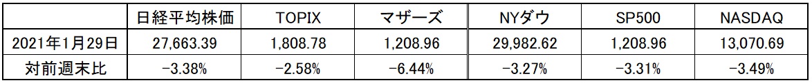 2021年1月最終週(1月25日~1月29日)もアメリカの株式市場の動きが日本の株式市場の動きを左右したが、米国市場はごく一部の投機的な動きをしていた銘柄を除いて全体は大した動きにはなっていない(下のテーブル参照)。話題になっているのはロビンフッド・マーケッツ社が同社の株式投資アプリで提供しているプラットフォーム上で投機的な売買を行う個人投資家の動きと、その代表例としてのGAMESTOP(GME)の値動きだ。