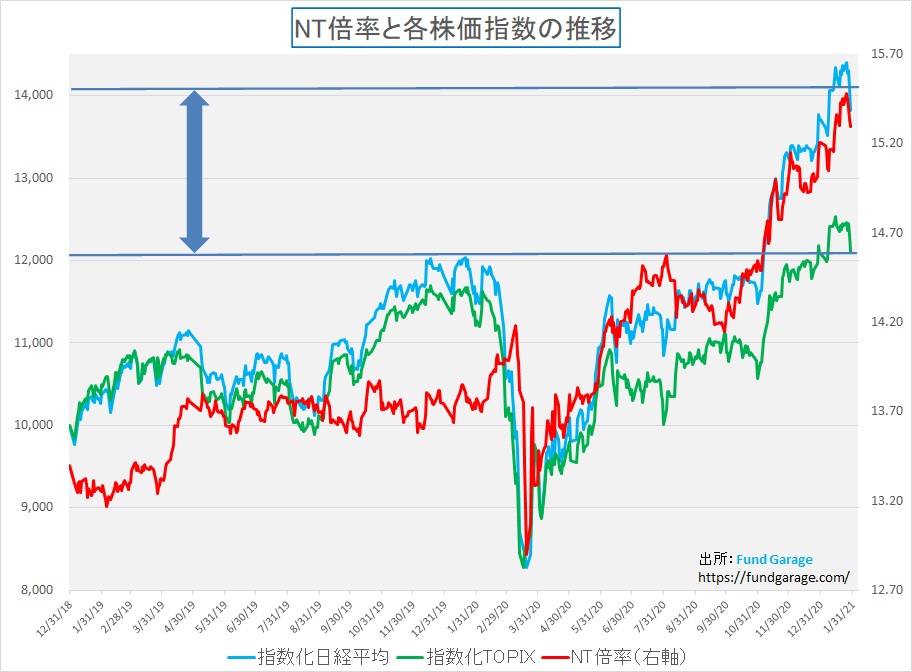 先週、日経平均はTOPIXが△2.58%下落する傍らで△3.38%と余分な下落を演じたが、これはまさしくNT倍率の調整。日経平均の方が割高に買われていた分の一部が修正された。これも下記のチャートをみれば一目瞭然だ。赤線で示したNT倍率が低下している。数値にして高値の15.48倍から15.29倍と0.19倍分の調整。日経平均の値幅で言うと343.67円程度だ。下のチャート、値幅を示す線は前週1月21日現在の日経平均とTOPIXのスプレッド(開き)を示すが、TOPIXの終値に合わせると青い線の日経平均がより下落して幅を狭めているのが分かる。だから印象的により下落したように感じるかも知れないが、その差分を調整すると週を通じた下落幅は△968.06円から△624.39円幅へと変わる。