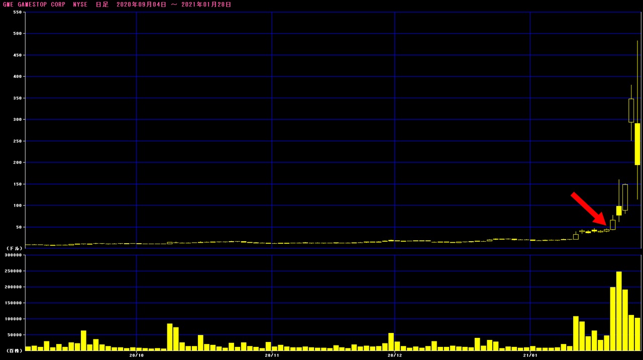チャートでその動きを確認すると、その動きには寧ろ感嘆してしまう。昨年9月からの日足チャートだが、ローソク足の右から6本目、すなわち先週木曜日(1月21日)の終値は43.03ドルでその前一週間は概ね40ドル台で推移している。ただ出来高だけは急に10百万株台に増えている。それ以前に遡ると価格は15ドル台から20ドル前後でしかない。話題となったのは現地1月28日の値動きで、チャートのローソク足で言うと一番右側だ。なんと一日の株価の値幅が369.45ドル(高値482.95ドル、安値113.5ドル)にも及ぶ。朝の寄付きは289.99ドルで終値は193.6ドルだからローソク足のボディー部分だけでも96.39ドルもある。日本株にはストップ値幅制限があるので、こんな激しい値動きは有り得ないが、幸か不幸か米国株式に値幅制限はない。そしてすったもんだがあって週末終値は325ドル、前日よりも+67.87%も上昇して終わっている。正に天国と地獄のギャンブル・ゲームだ。