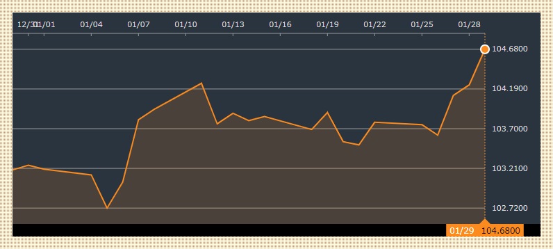 上記は先週一週間のイールドカーブの動き。データを記録しているのが馬鹿らしくなるぐらいにほぼ毎日同じ水準から動かない。そしてドル円相場も2021年は円高見通しを主張する為替ストラテジストが殆どだったが、少なくとも最初の1か月間、彼らの見通しは全面的に外れた。下のチャートはドル円相場のこのひと月間を示す。月末の終値は104.68円だ。