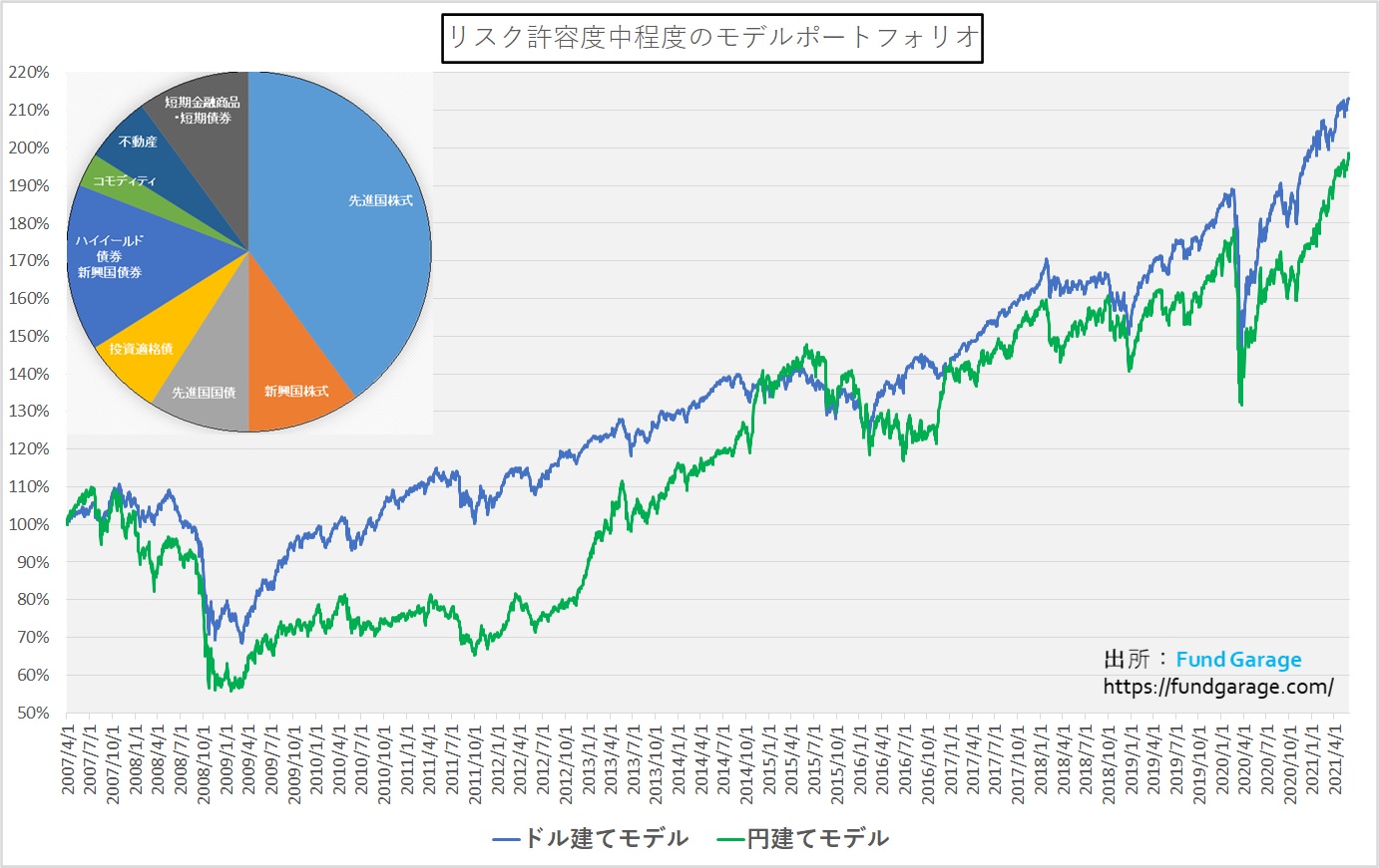 「リスク中程度のモデル・ポートフォリオ」の2021年5月末までのパフォーマンスは、ドル建てポートフォリオで設定来が月末213.33%(設定来年率5.49%複利)となり、2021年年初来のパフォーマンスは絶対値でプラス6.38%、2020年年初来のパフォーマンスは絶対値でプラス15.53%となりました。円建てポートフォリオは5月末時点で198.77%ですから、2021年年初来のパフォーマンスは絶対値でプラス12.99%、2020年年初来のパフォーマンスはプラス16.83となります。ドル建てと円建てポートフォリオのパフォーマンス差は為替が要因です。4月末時点ではドル円は108.95円台(3月末は110.70円)でしたが、5月末時点では109.90円と再びやや円安へと振れました。完全にボックス圏になっています。ただこの円安分の0.87%はドル建てモデルに比べて優位に作用しますから、その分は良好な結果となっています。