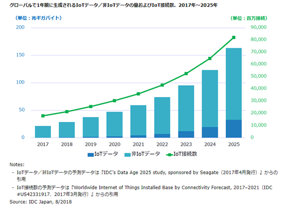 IDC(International Data Corporation)の調査によると、グローバルで1年間に生成されるIoTデータ/非IoTデータの量およびIoT接続数の推移は、下記のチャートのようになると予測されている。そして注釈に示してあるように、これは米国Seagate社(HDDの大手)の依頼で調査して、今から2年前の「2017年4月」に元ネタは発行されている資料なので、恐らく今足元で再調査をしたら更に上方修正されている筈だ。