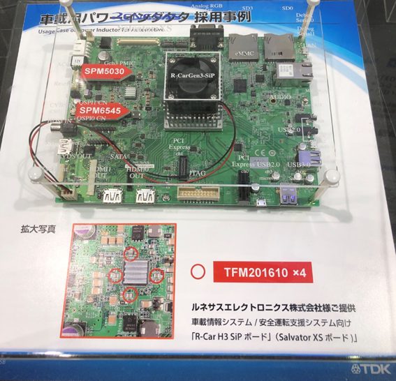 もうひとつが車載情報システム/安全運転支援システム向けのもの。良く見て頂くと、TDKが本来見せたかったパワーインダクタという電子部品以外に、多くの部品が基板上に並んでいるのが分かる。前述の通り、私的には、これらが一番興味をそそられる。