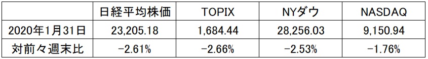振り返ると大変な一週間だった。前回予想した通り、日に日に新型コロナウイルスの感染者数が拡がるさまを見て、世界も市場も大混乱になり始めたからだ。その傍らで10-12月期の各企業の決算発表が本格化し始めた。そして先週末はNYダウが600ドルを超える下落を演じて幕を閉じ、英国がEUを脱退した。そして週明け、今度は春節が開けた上海と深センの取引が再開される。こんな時、実は投資家のすべき(売り買い)ことはあまり多くない。当然、その中に「狼狽」という文字は無い。誤解を恐れずに敢えてコメントすれば、投資をしていれば良くあること。「いや、今回は違う」という賢者も数多いるが、いつも「今回は違う」のである。同じだったことはただの一度もない。そして投資を続けることから決して逃げてはいけない。