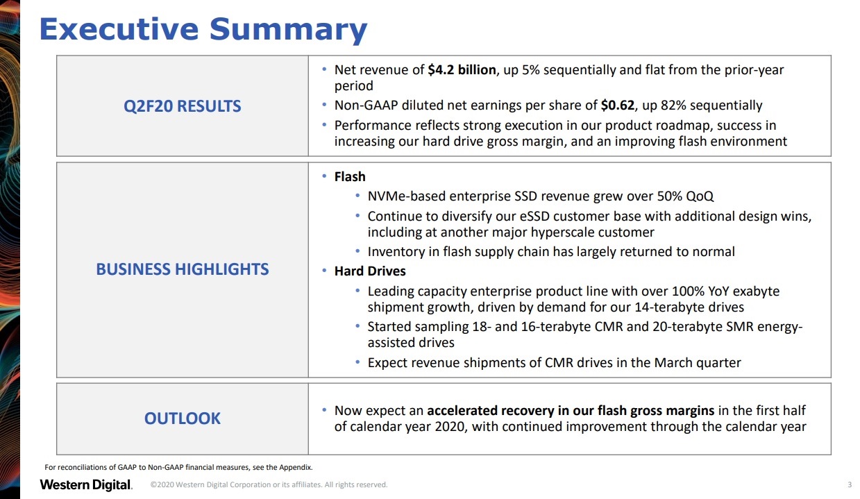 ウェスタン・デジタルの決算発表も良かった。下記は決算説明用資料からの抜粋だが、これを見てケチをつけるタイプの人は、きっと長期の投資家にはなれない。インテルをはじめとする他社のコメントなどとも整合的であり、何ら不安なところはない。特にOUTLOOKのところのコメントに注目して欲しい。