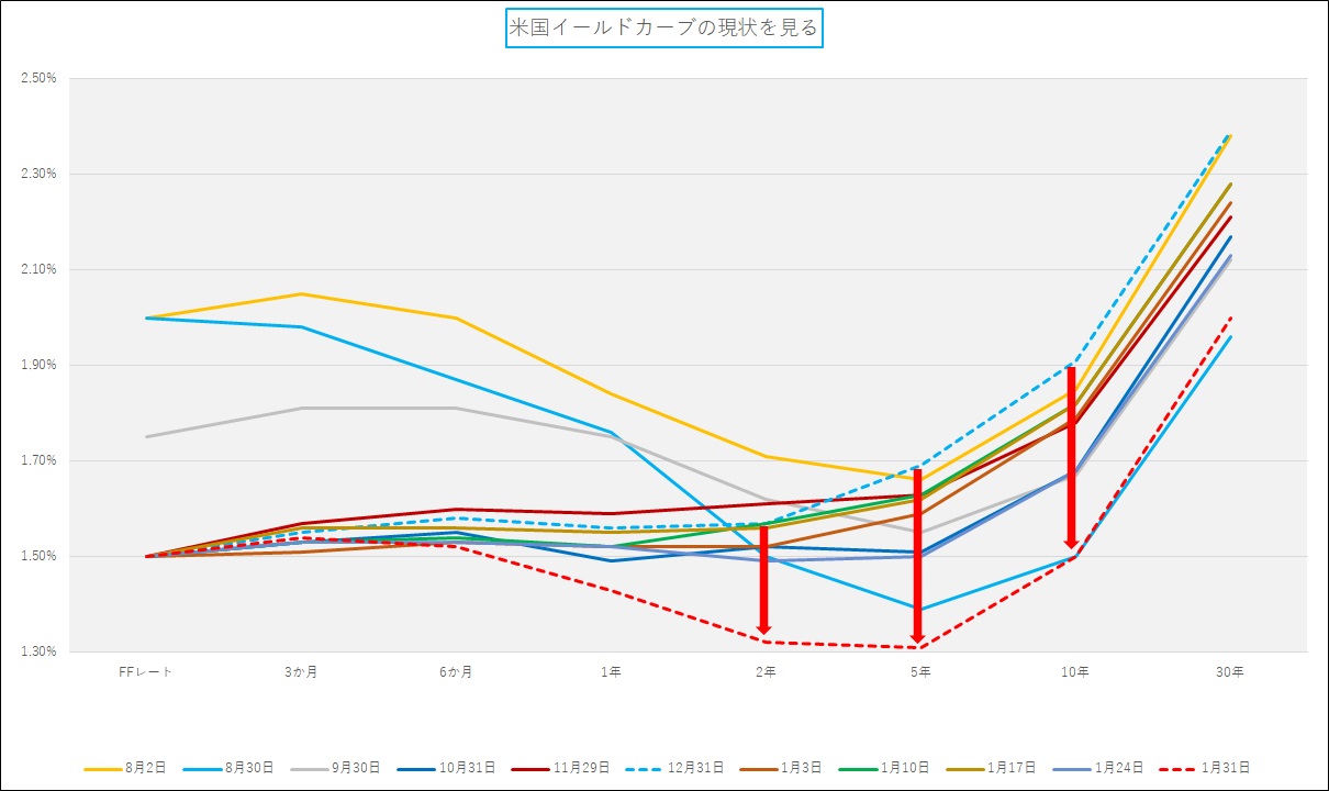 一方、今年に入ってから非常に私が気にしているのが米国のイールドカーブだ。昨年末12月31日のそれは水色の点線で示す通り、それなりに順イールド(期間が長いほど金利が高い)になっているのだが、赤色の点線で示す先週末のラインは完全に2年~5年ゾーンがより短い期間の金利よりも低くなっている。