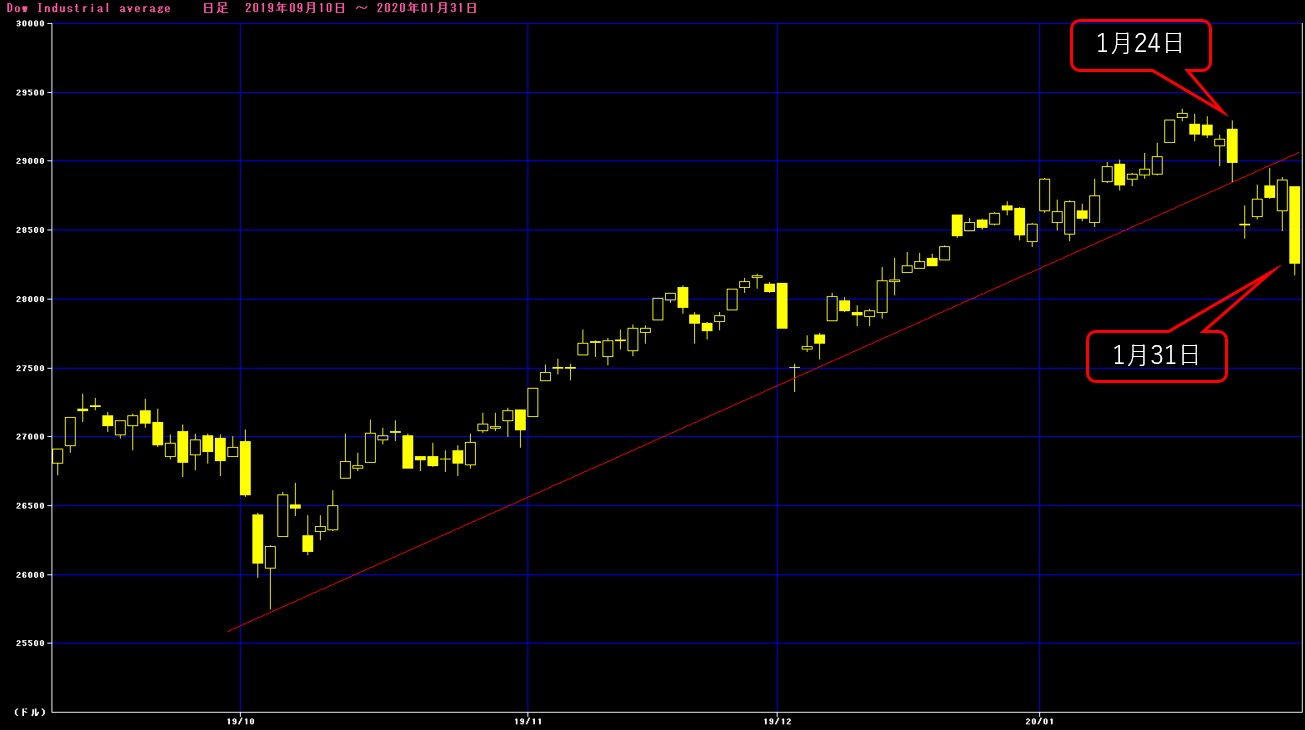 まずは冷静に市場を見て置こう。下のチャートはNYダウの日足だ。最後に大きな大陰線を残して終わっている。寄付きが高値となって前日比△603.41ドルの下落。下髭は僅かに46.4ドル分しかない。先週末も新型コロナウイルスの話題で下落はしているが、その幅は僅か△170.36ドルに過ぎない。如何に今週はこの件で市場の腰が如何に引けたのかが分かって頂けよう。