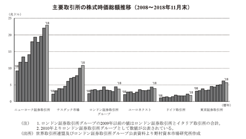 下のチャートはは、野村資本市場研究所が作成した、主要取引所の株式時価総額推移を2008年から2018年11月末までをまとめたもの。一番左の山がニューヨーク証券取引所の時系列の時価総額推移で、一番右側が丘のような感じなのが東京証券取引所だ。