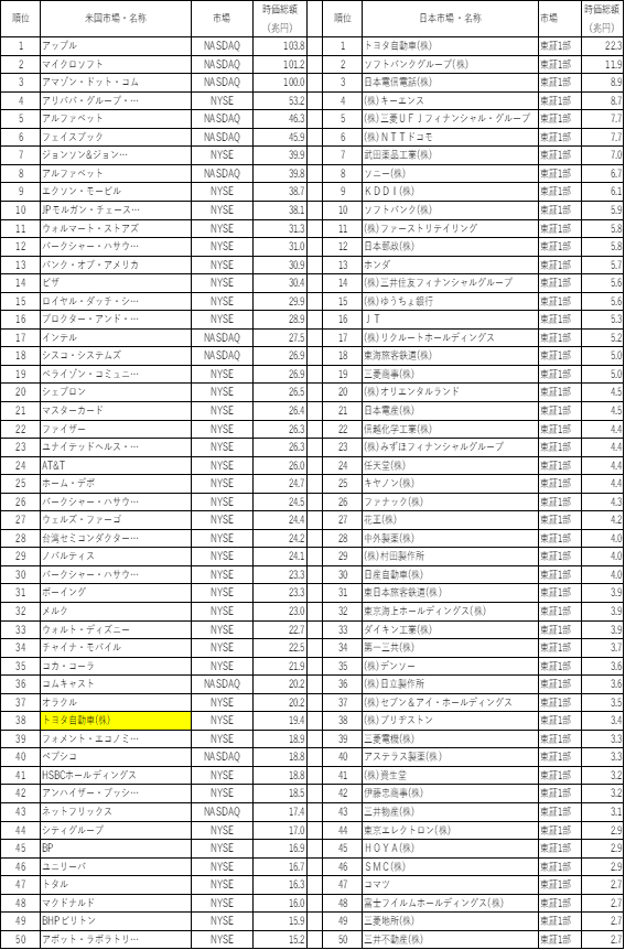 下の表は直近(2019年4月9日付(米国は4月8日付))の上場株上位50社の日米比較だ。すべて単位は兆円に揃えてあるが、我が国最大の時価総額を誇り、第2位のソフトバンクグループの約2倍の時価総額を誇る天下のトヨタ自動車でさえ、米国市場の中に入れると第38位となってしまう。更に言えば、米国市場で第50位となるアボット・ラボラトリーでも、日本市場の第2位のソフトバンクグループよりも時価総額は約4兆円も大きな数字になる。これだけ市場規模が違うというのが事実だ。