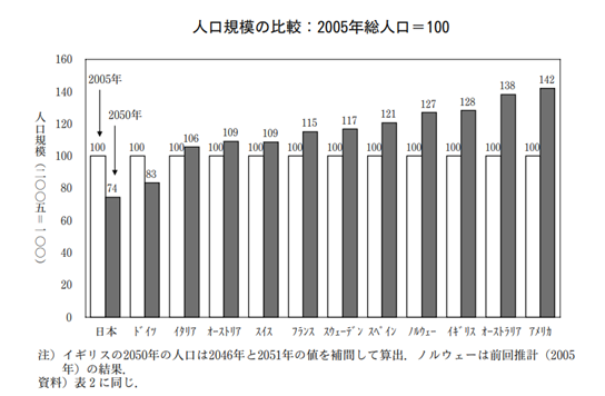 2005年を100としたチャートなので、やや古いことは認めるが、残念ながら、その後日本の出生率が大きく上昇したという話は聞いていない。つまり状況は変わっていない。従って、当たらずしも遠からずの結果であり、一番左側が日本、そして一番右側がアメリカだ。