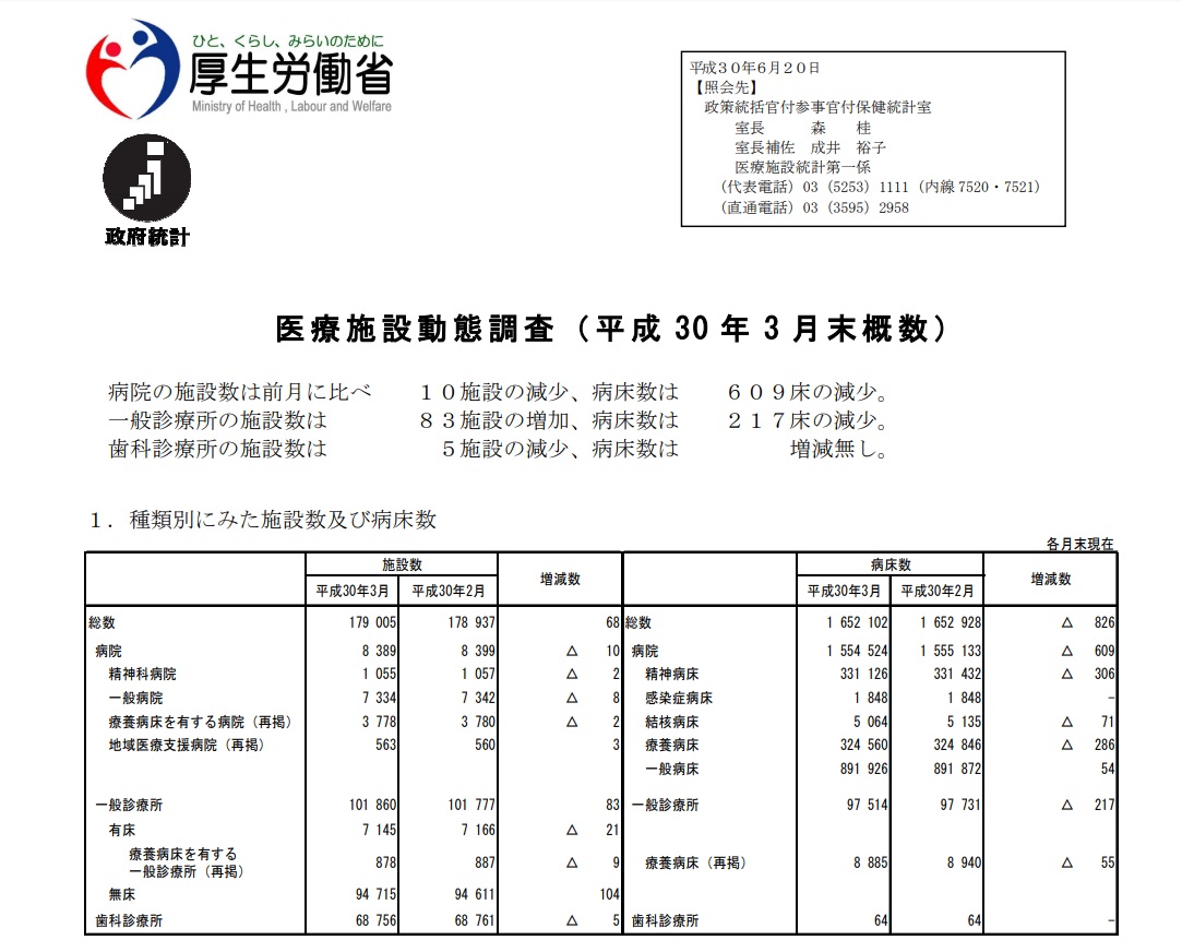 下記に厚生労働省が平成30年6月20日に発表した「医療施設動態調査」の表をお見せする。注目して頂きたいのは、下段右側の表の中ほどにある「感染症病床」の数だ。ご覧頂ける通り、日本には感染症に対応した「感染症病床」は僅か1,848床しかない。