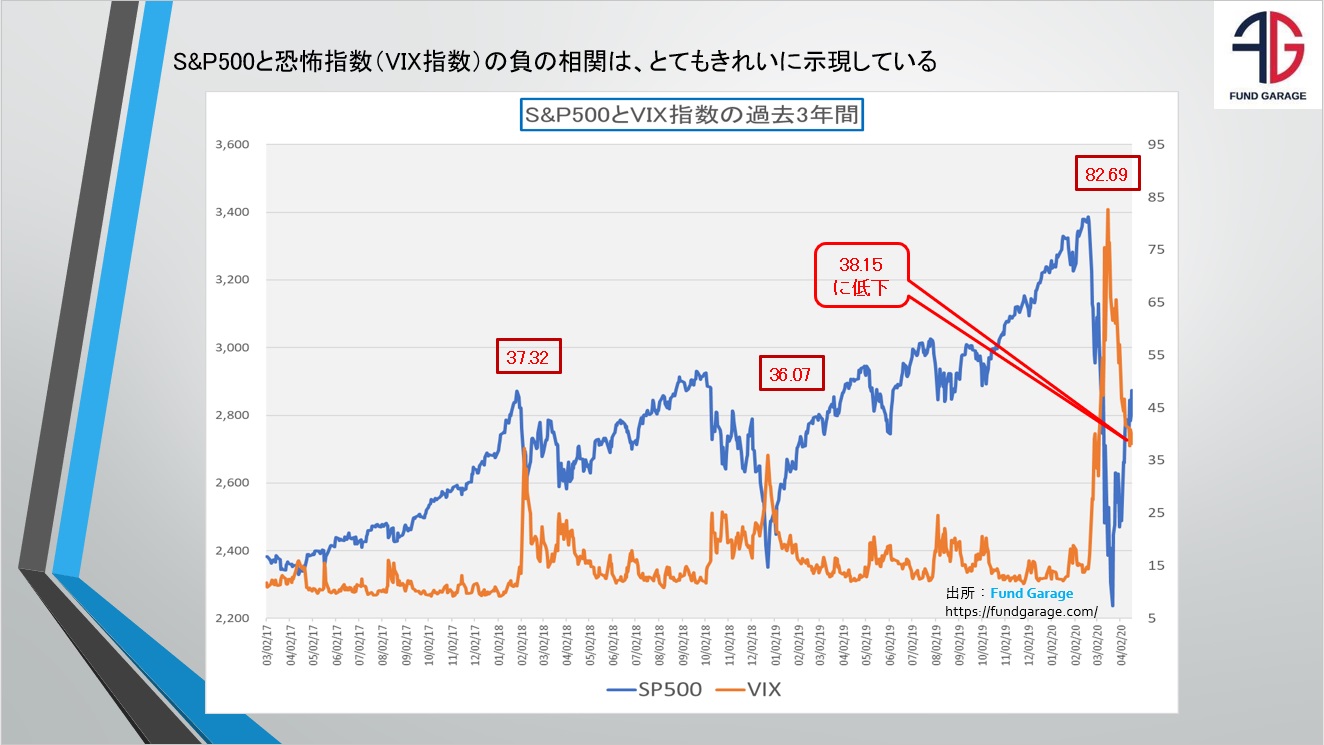 今回、過去3年間のボラティリティの高値を越えて一旦低下が始まった(株価はリバウンド)段階で「ここで底かな?」と思ったが、もう一段の株価の下げとボラティリティの上昇があったという例だ。だが、過去の経験から言えば、今回のように一旦82.69までザラ場ではリーマン・ショックの高値を超えるところまで恐怖指数(VIX指数)が一旦上昇し、その後ボラティリティの低下と株価の上昇が下記の図で示すような綺麗なチャートとなって騙されたことはない。