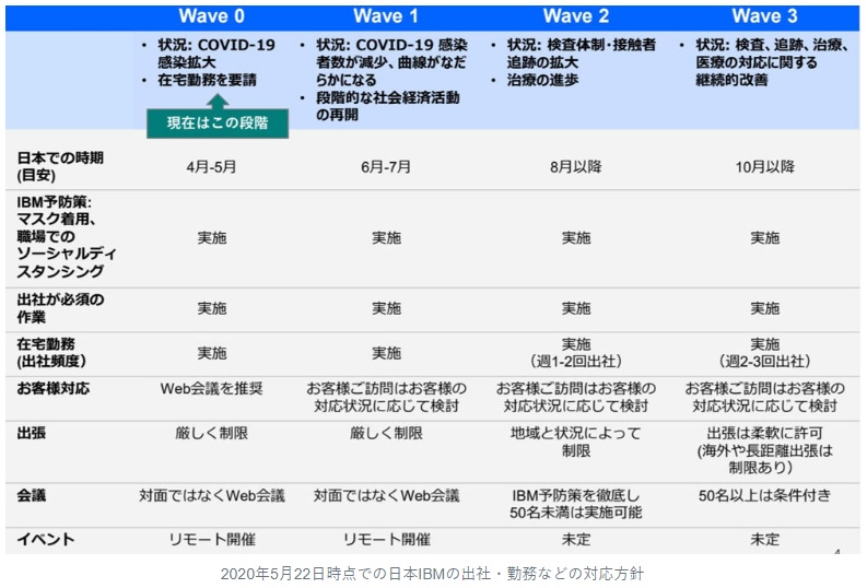 因みに下記は、日本IBMが5月22日に発表した新型コロナウイルス感染症に伴う政府の緊急事態宣言の解除後について、その勤務体制など対応方針をまとめた「Return to Workplace」だ。現在95%の社員を在宅勤務としている同社だが、7月末ではこのままの状態が続くようだ。10月以降でも週に2-3日の出社であり、5日間の出社計画は無い。そしてこれが第2波は来ないベストシナリオでの計画だということを忘れてはならない。もし第2波が来てしまったら、現状の95%が在宅勤務の生活様式が維持される。