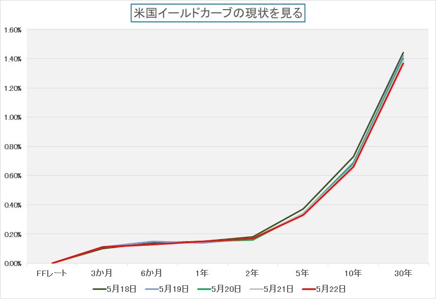 先週一週間の米国債券のイールドカーブを全部表示してみた。殆ど今週は動きが無いことは、5本ある筈のラインが上手く区別できないことでも明らかだ。
