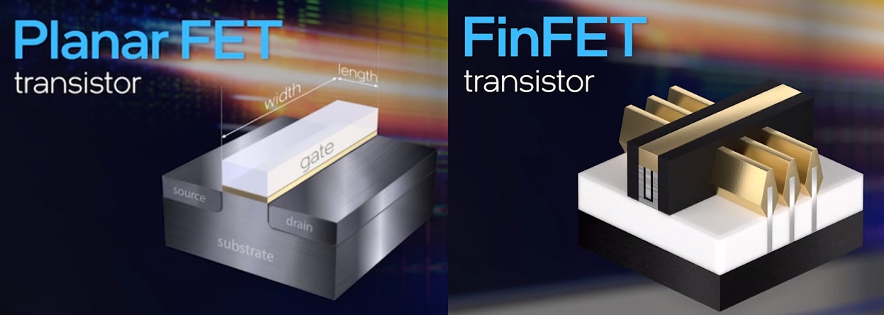 現在、半導体の製造技術の進歩度合いを言い表す方法で一般的なのは、半導体のゲート長を示して「7nm」とか「5nm」とか呼ぶ方法だ。具体的には下の写真の左側だ。昔はこの「gate(ゲート)」とある白いバーの「length(長さ)」の部分を物理的にどこまで細く加工出来るかで「ノード」と呼ぶ世代の説明が出来た。何故なら、これが物理的な線幅に一致したからだ。だが2011年にインテルは右側のFin FETという技術を採用してしまった。この写真でも明らかな通り、実は最小加工寸法は前述したゲート長では無くしまったいる。Finの幅だ。だが業界では慣習としてこの呼び方を続けている。だからこそ、この見方を変えて欲しいというのがインテルの意図でもある。