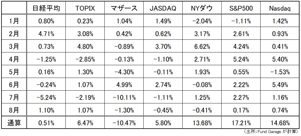 参考までに、年初来の日米主要株価指数の月次騰落率と、年初来(8月4日迄)通算した騰落率の一覧を掲げる。米国株3指数の状況と日本株市場の状況の違いは一目瞭然だ。更に言えば、マザーズの落ち込みようがかなり厳しいのが分かる。