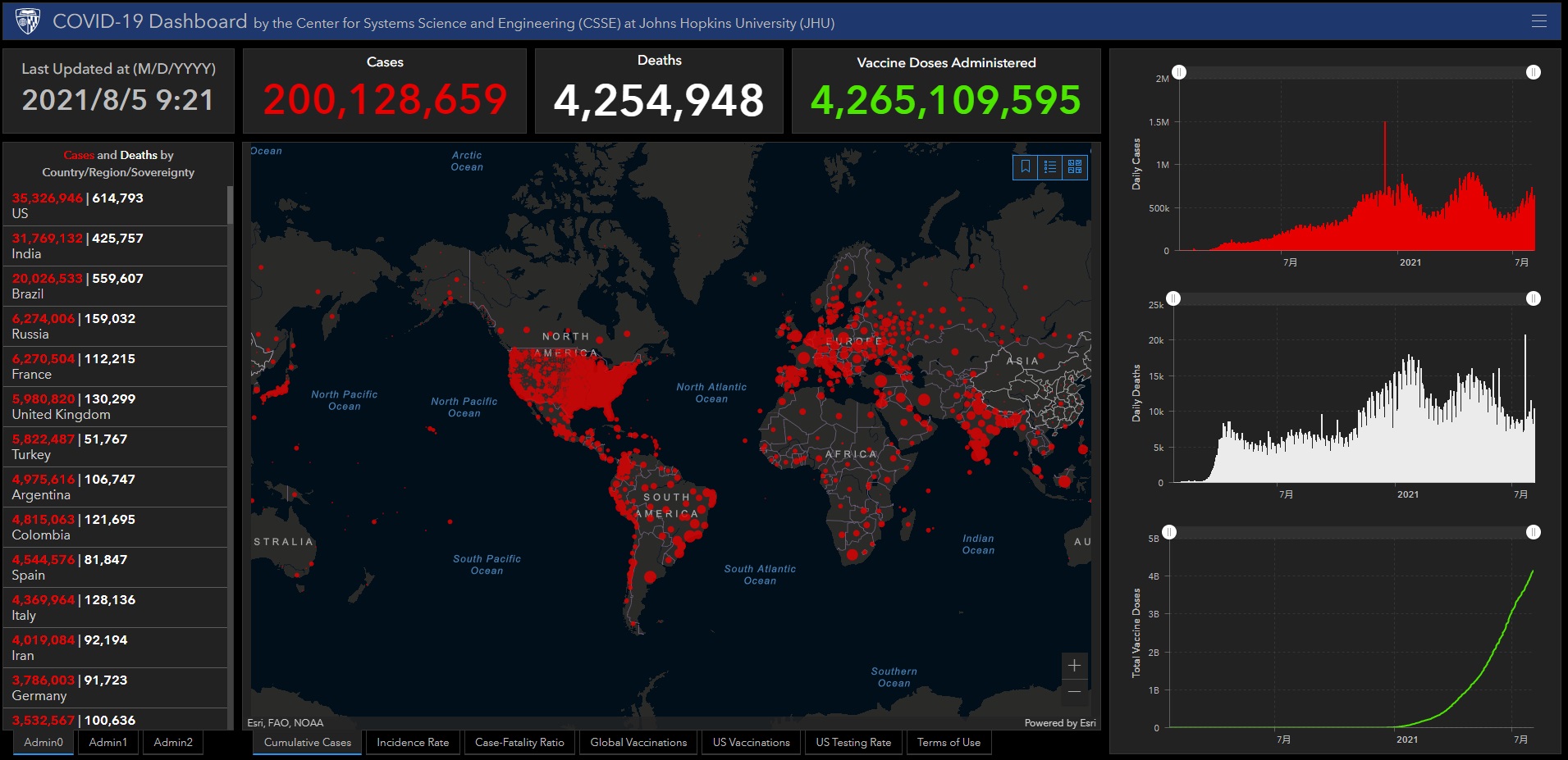 前述した通り、今年2021年も世界は新型コロナウイルスの感染拡大騒動に振り回されている。お気付きの方も多いと思うが、今年のマーケットの動き、すなわち株式市場、債券市場(金利)そして為替市場の動きについて、最も予見的な示唆を与えてくれているのはとても身近な統計だ。それが世界の新型コロナウイルスの感染状況であることをご存じだろうか?例えばそれは下記のジョンズホプキンス大学のWebページで常に公開され更新されている。Fund GarageのWebページでも5月のGW明けまでは毎日その変動を分析してコメントしていたので、このWebページをご存じの方も多いだろう。私はその後も実際に習慣として毎日チェックを続けているので、その先見性にそう断言出来る。