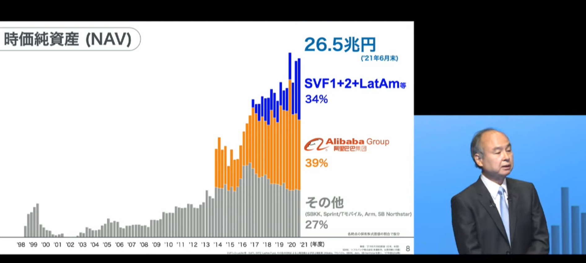 ならば同社の決算内容で一番注目すべき点は何かといえば純資産(NAV)の変動状況(下記チャート)だ。その意味において、このチャートが示す通り、NAVは順調に伸びており、特に問題とすべき点は見当たらない。3期前のNAVに占めるAlibaba Groupの時価総額が突出しているが、パンデミックが始まってE-Commerceへの注目も需要も大きく伸びた時だと理解出来、それを含むNAVに今期は既に肉薄している。