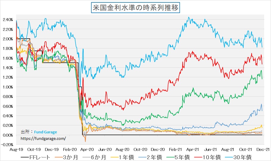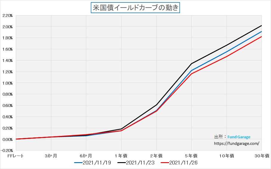 米国債券市場がそれほど混乱していることを示しているのがこの一週間のイールドカーブの動きです。実は「インフレ懸念」や「早期利上げ懸念」と解説されている株式市場の動きとは異なり、11月第4週のイールドカーブは下方にドリフトダウンしています。つまり「金利は低下している」ということで、多くの解説とは真逆の動きになっているということです。