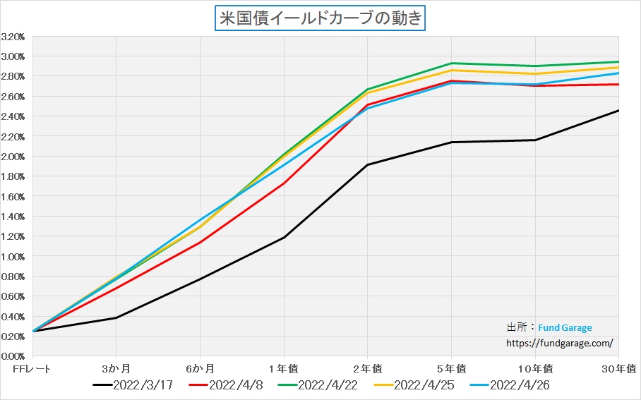 株価の下落要因として頻繁に使われる「金利上昇」(FRBの姿勢を含む)という材料は、あまりにも安直に使われている気がしてならない。その議論はここでは置いておいて、次のチャートを見て頂こう。米国のイールドカーブだ。黄色い線が今朝終わった(現地26日)米国市場のものだ。実は金利は低下している。