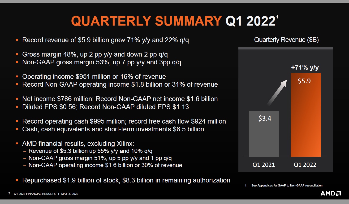 2022年の第2四半期のAMDの予想収益は、コンセンサスが63億6000万ドルであるのに対し約65億ドル、プラスマイナス2億ドルで、前年比で約69%、四半期で約10%増加しています。2022年の第2四半期の非GAAP粗利益が約54%になると予想している。